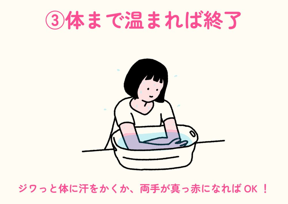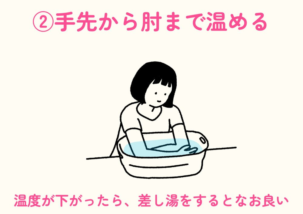 野口整体のやり方は肘だけ漬けるみたいですが、井本整体では肘から先を全部湯に入れて温めます。個人的には井本整体式の方が効果があるように感じます。