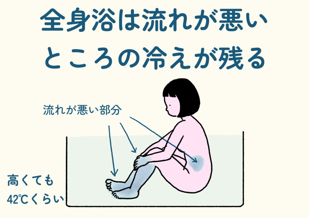 全身浴は、流れが良いところが先に温まってのぼせてしまうから、本当に冷えているところに熱が入る前にお湯から上がってしまうから冷えが残ってしまいます。